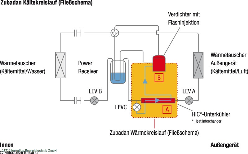Die positivere Energiebilanz und bessere Betriebssicherheit liefert die Zubadan-Technologie dank der sogenannten Flash-Injection: Diese patentierte Kältemittel-Einspritzung ermöglicht, dass über einen separaten Wärmetauscher in Abhängigkeit von der Außentemperatur ein variables Gemisch aus flüssigem und gasförmigem Kältemittel hergestellt und direkt in den Kompressor injiziert wird. Nun kann die Betriebsfrequenz des Verdichters erhöht werden, da die Flash-Einspritzung für stabile Kondensationstemperaturen sorgt und den Kompressor gleichzeitig vor Überhitzung schützt.